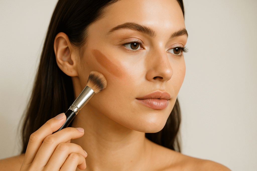 Rozświetlacz na kościach policzkowych doda świeżości, a bronzer w odpowiednich miejscach pozwoli wyrównać proporcje.