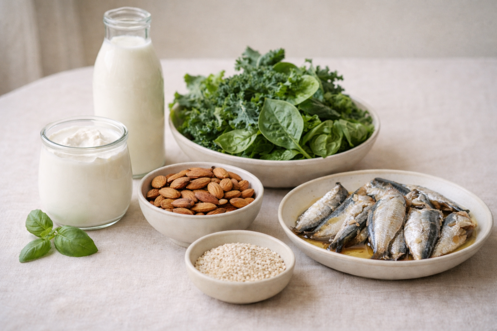 Ryby z ośćmi, zielone warzywa liściaste, sezam, migdały — to dobre uzupełnienie diety.