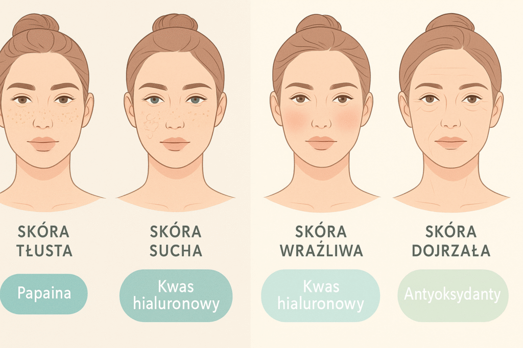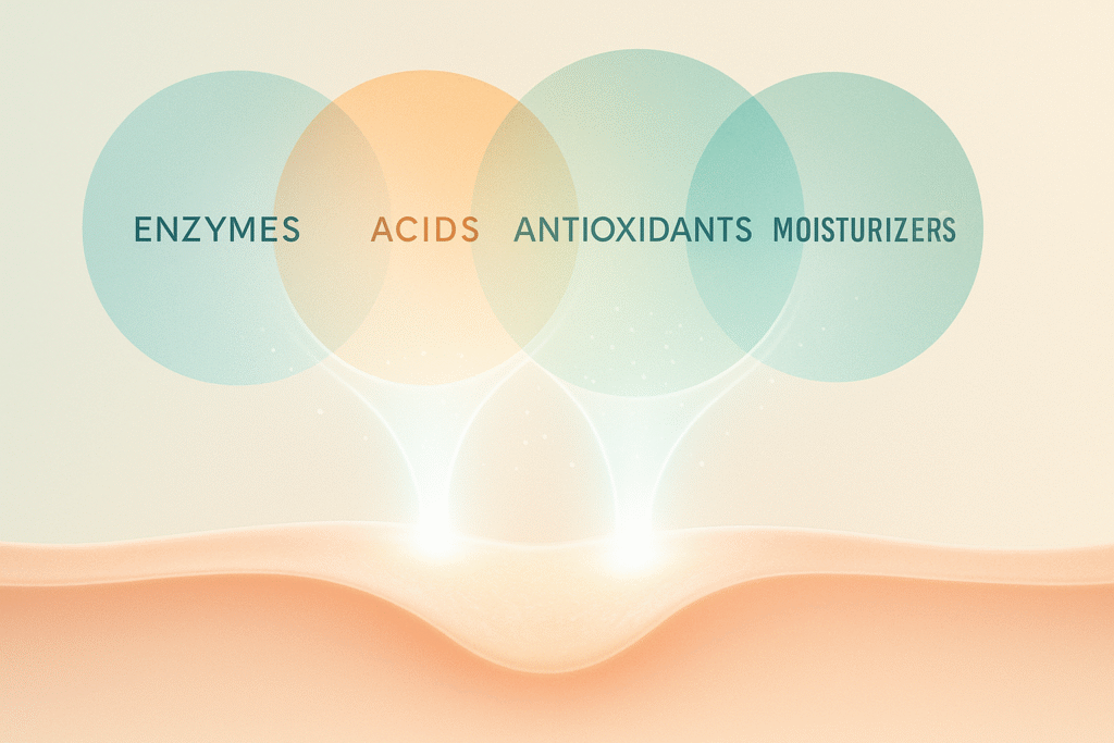 Najlepsze efekty daje połączenie enzymów z innymi substancjami aktywnymi. Enzymy rozpuszczają martwe komórki, kwasy owocowe wspierają regenerację, antyoksydanty chronią, a humektanty zapewniają nawilżenie. Taka synergia sprawia, że skóra jest gładka, rozjaśniona i jednocześnie silniejsza.